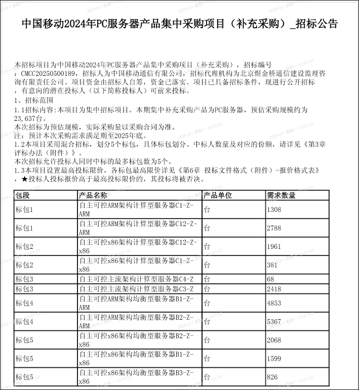 中国移动采购与招标网日前新增一则招标公告。其中显示在线炒股配资,中国移动已于8月30日启动2024年PC服务器产品集中采购项目(补充采购)。